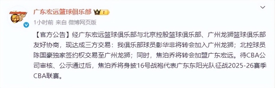 今年CBA球员注册期的最后几天非常热闹,接连发生了几笔重量级的球员转会,广东男篮、上海男篮和北京男篮的国产球员阵容都得到了补强,再加上卫冕冠军广厦男篮,这四支球队基本上会锁定新赛季的四强席位,其他球队很难和这几支球队竞争。广东男篮已经发布官宣,表示球队已经和北控男篮、同曦男篮完成了三方交易,彰华非将转会加入广州龙狮;北控球员陈国豪独家签约权交易至广州龙狮;焦泊乔将转会加盟广东宏远。另外北控男篮追逐王岚嵚未果,双方在转会费方面没有达成一致,王岚嵚将会继续留在辽宁男篮效力。
